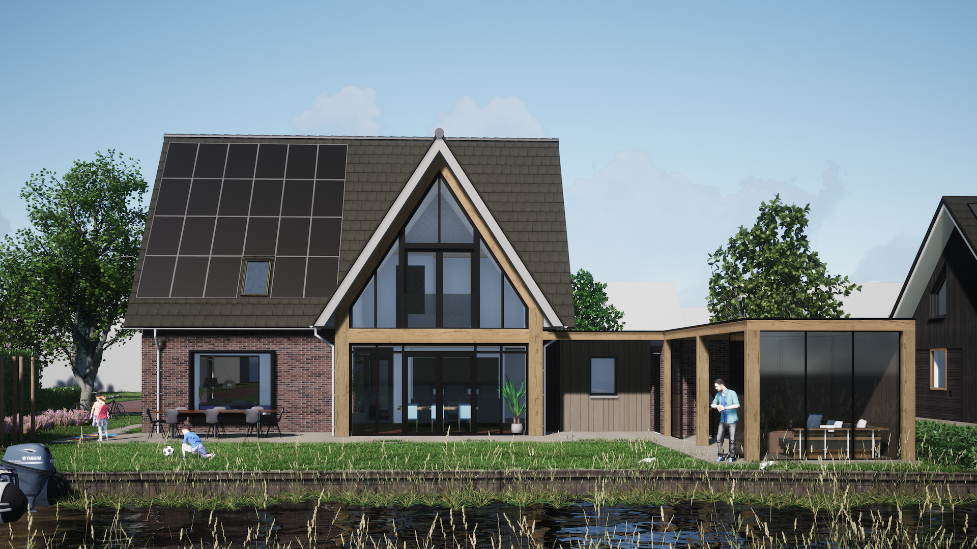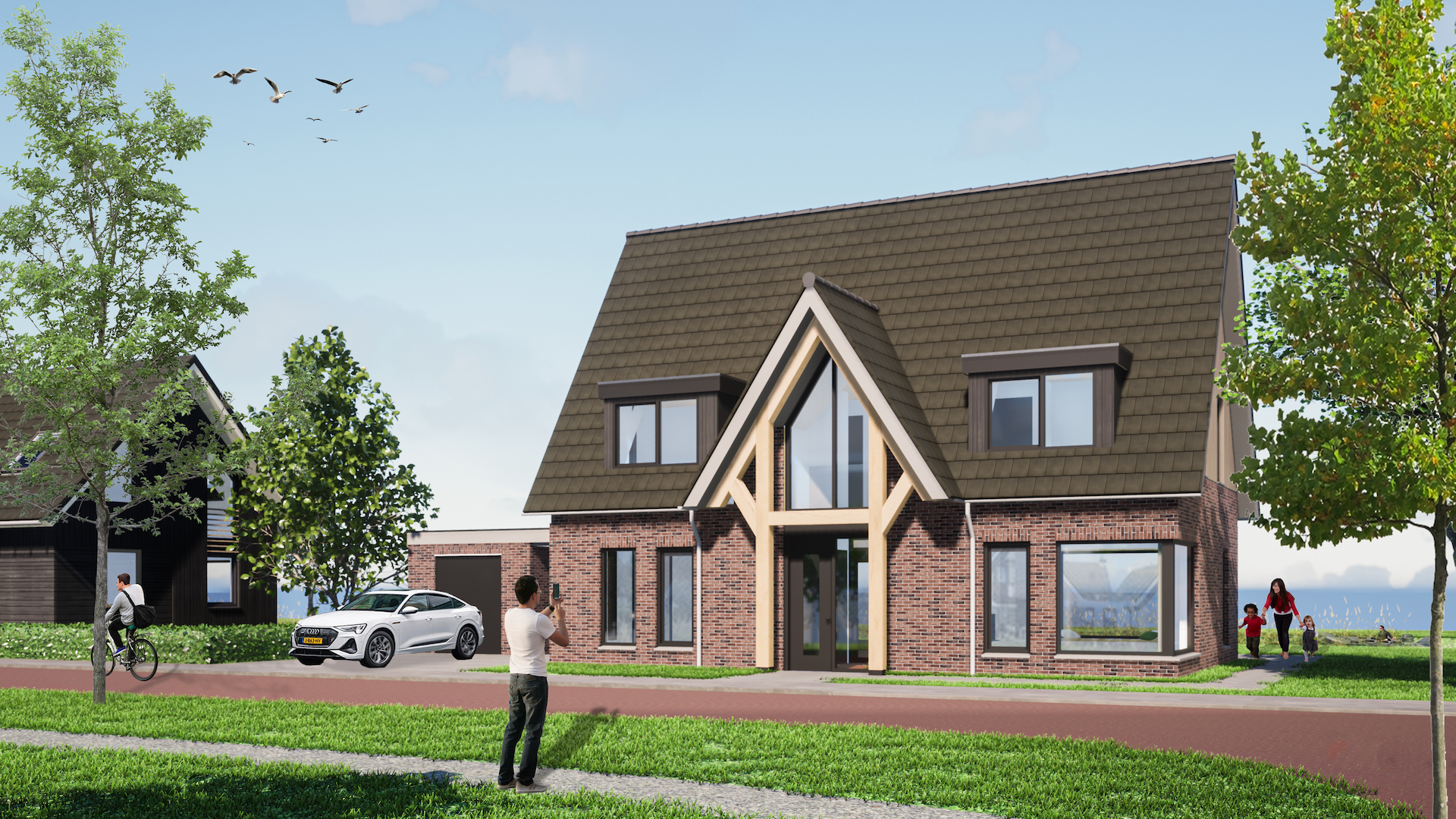 Zo zijn de gevelvlakken uitgevoerd in strakke houtverdelingen en is het metselwerk in combinatie met riante en strakke kozijnpartijen ontworpen.