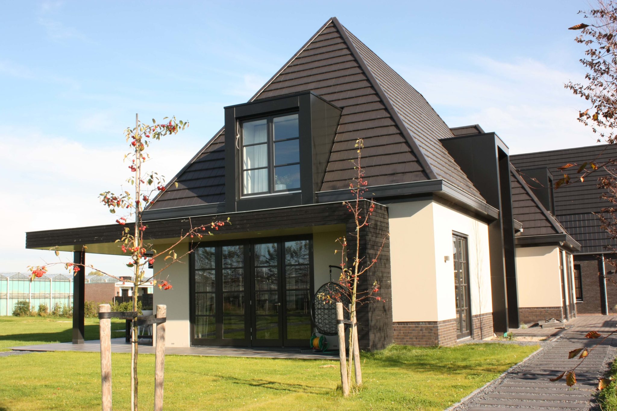De woning met schiltkap staat aan de rand van het nieuwbouwplan Groote Geldebosch en is zowel van buiten als binnen oogstrelend mooi. De woning is lichtgrijs gestukt en voorzien van zwarthout dakranden die de tuinkamer van de woning accentueren. Het huis is rondom voorzien van dakkapellen die het grote dakvlak onderbreken en de woning karakter geven.