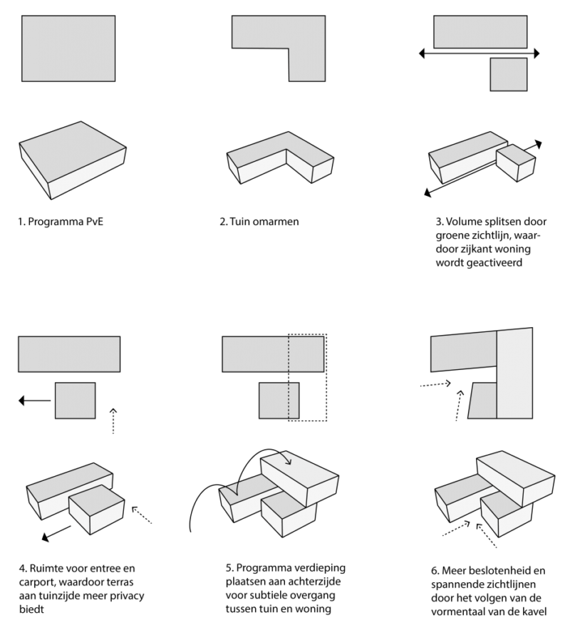 De oorspronkelijke jaren ‘60 woning, gelegen in een bosrijke omgeving was gericht op de zonnige zuidzijde. Omdat de contouren van deze woning bepalend zijn geweest voor het bestemmingsplan is in het nieuwe volume passend binnen deze contouren ontworpen. De bewoners hadden de wens om de woning en de tuin te integreren. De tuin en de bosrijke omgeving is schitterend om aan te wonen. Een echte kwaliteit die we wilden koesteren in het ontwerp. De overgang naar dit bos is geleidelijk, een graduele overgang van privé naar openbaar. In de woning voelt het alsof de tuin onderdeel is van de woning en andersom. Openingen zijn uit het volume gespaard waar nodig om lichtinval of uitzicht te creëren.