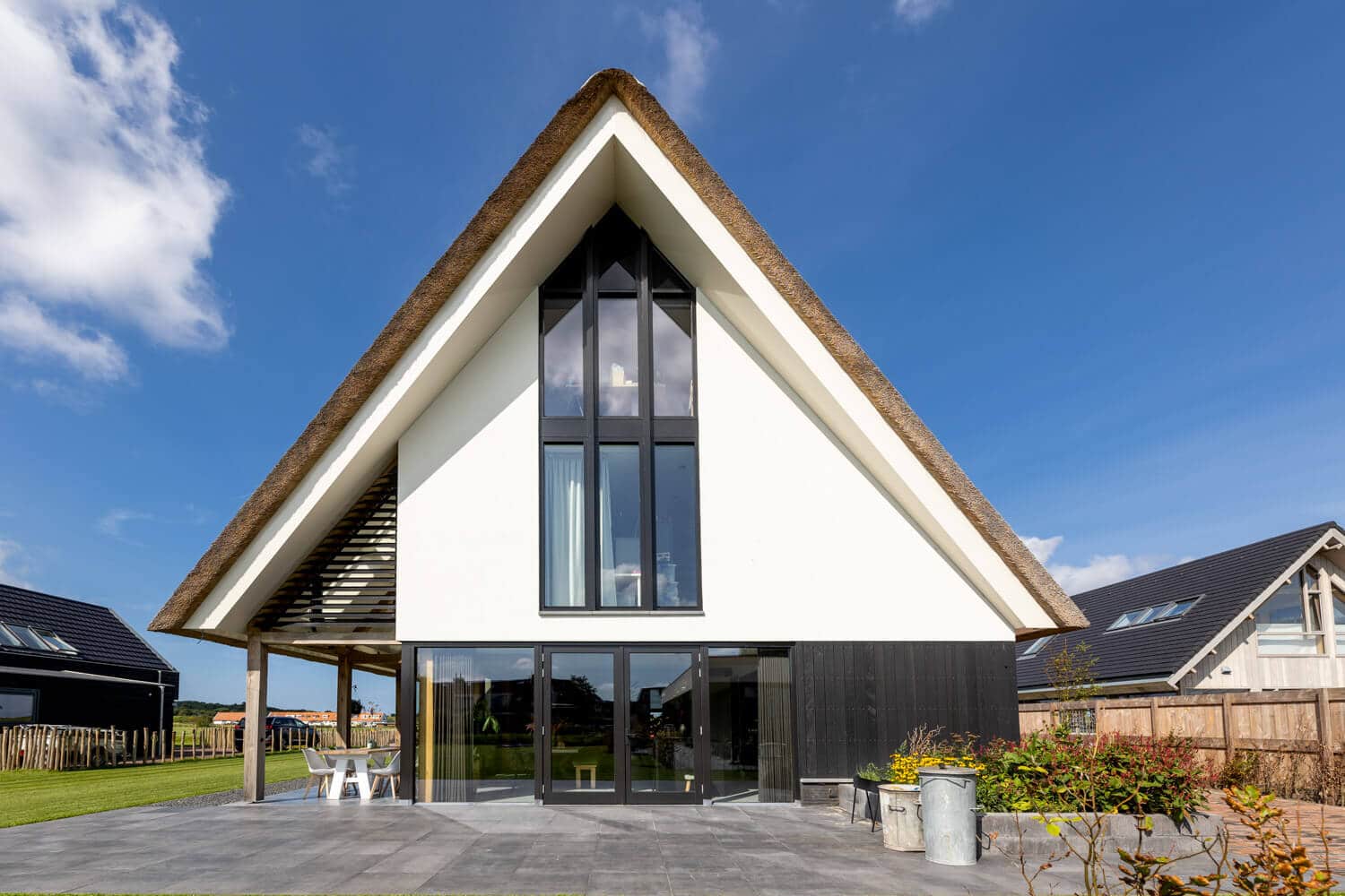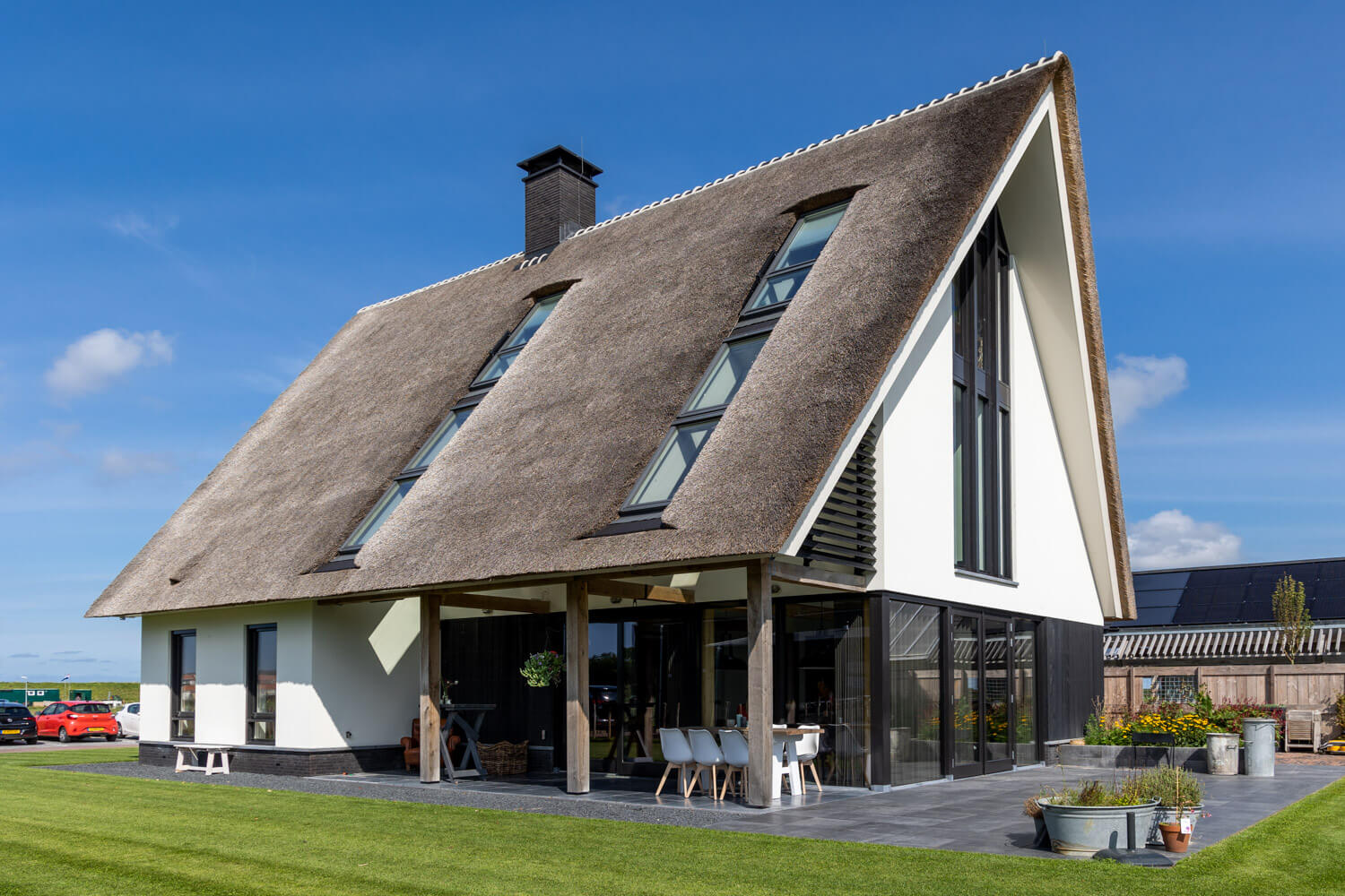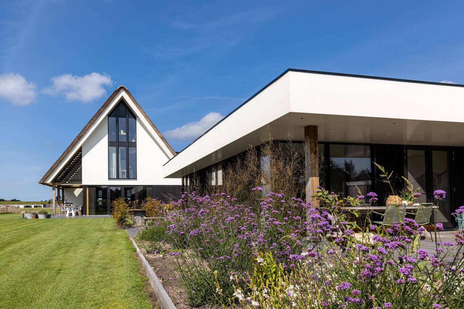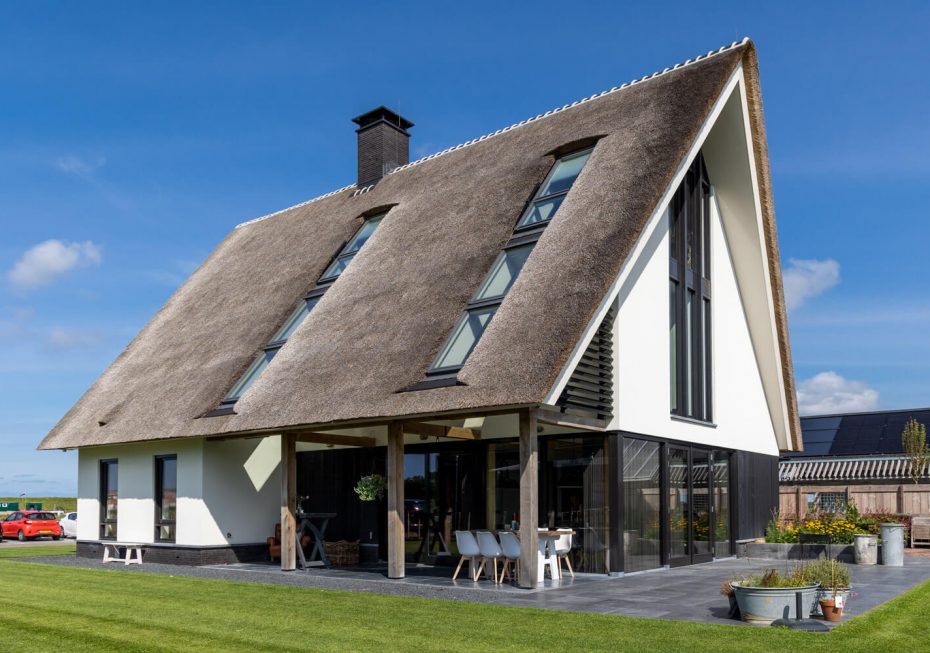 Aan de Hargerweg in Groet komt op een steenworp afstand van het strand en de duinen een prachtige landelijk moderne woning. Een Stucwerk gevel gecombineerd met zwarte houten delen en een rietgedekte kap welke rust op een eiken spantconstructie maakt het landelijke karakter van deze woning. De strakke, maar vooral heldere vormentaal geven de woning een volledig eigen identiteit.